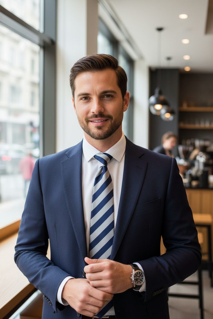Výrazně pruhovaná kravata má kontrastní modré pruhy pro sebejistý vzhled. Kravata je vyrobena z polyesteru a má klasickou šířku 7 cm.