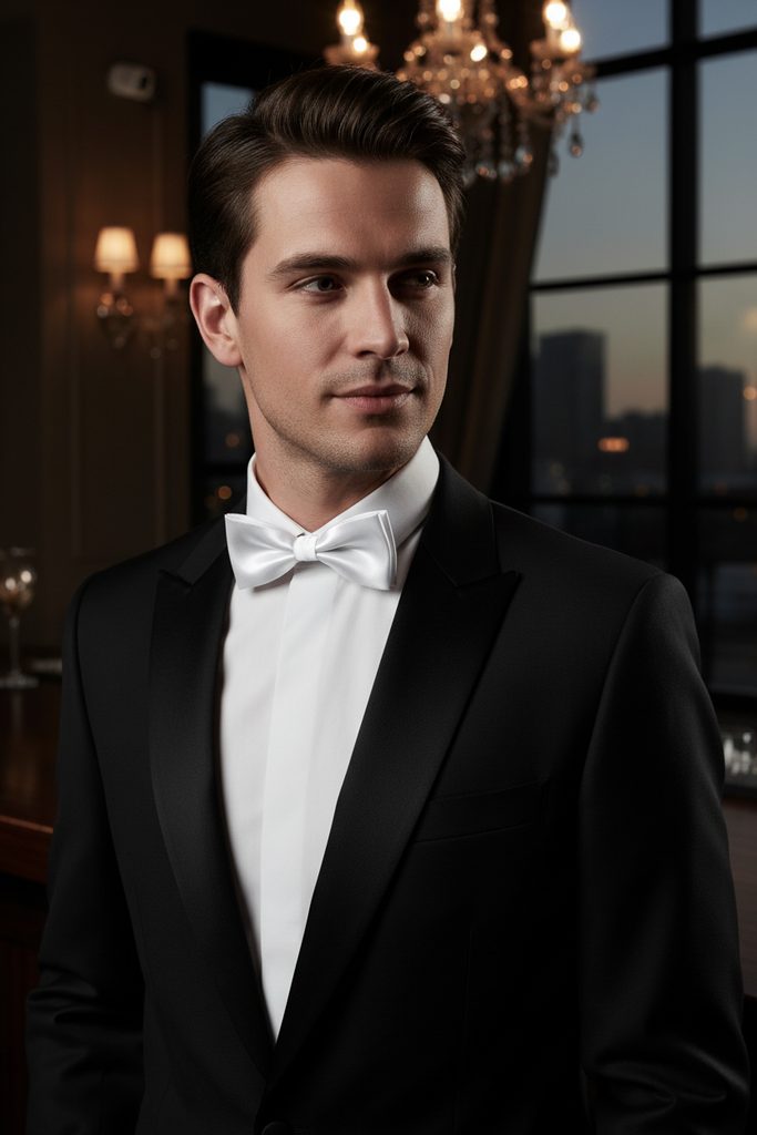 Předvázaný Bílý lesklý pánský motýlek velikost 12,5 cm dokonale padne k jakékoli frakové či smokingové košili. Na zadní straně motýlku je připevněn háček s očkem, díky tomu lze snadno regulovat délku dle obvodu Vašeho krku.