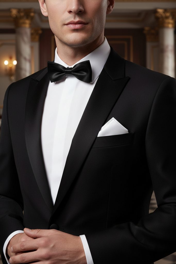 Předvázaný Černý, lesklý pánský motýlek Gala s bílým kapesníčkem dokonale padne k jakékoli frakové či smokingové košili. Na zadní straně motýlku je připevněn háček s očkem, díky tomu lze snadno regulovat délku dle obvodu Vašeho krku.