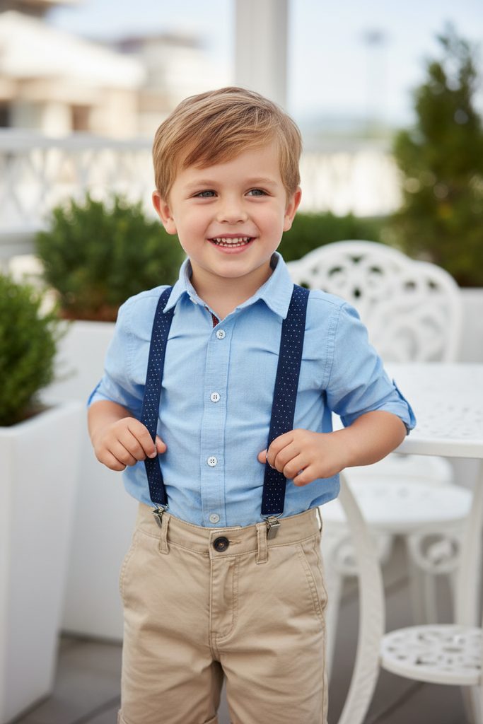 Tyto dětské šle jsou určeny pro naše malé elegány. Dětské šle Y modré s bílým puntíkem mají elastické pásky které jsou na koncích opatřeny kovovými sponami, díky tomu mohou být snadno připevněny ke kalhotám.