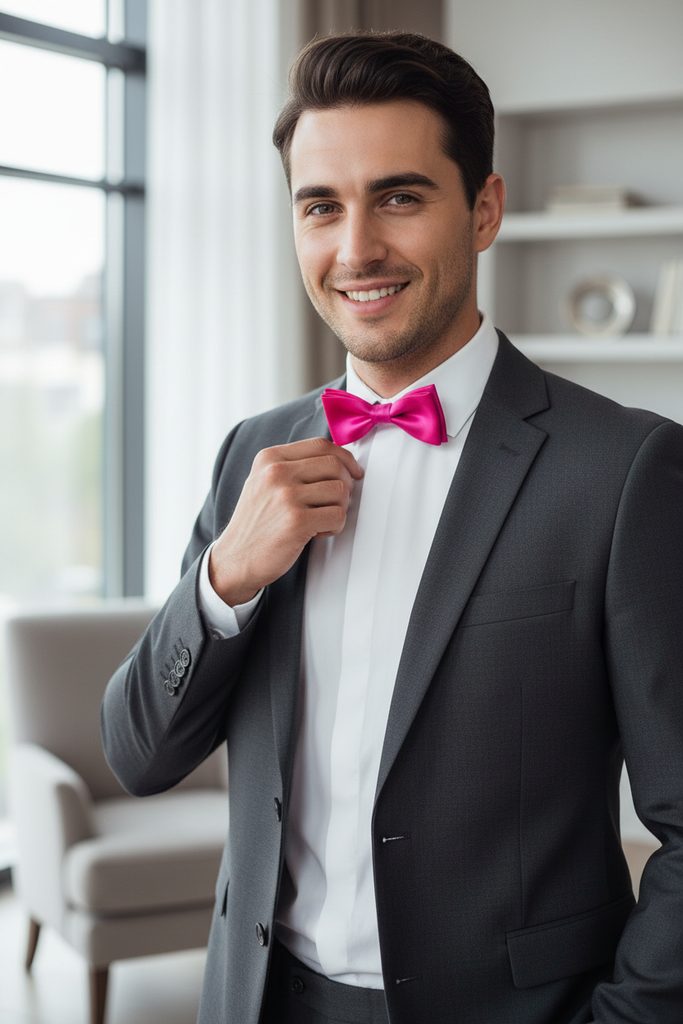 Komu se líbí Růžová barva a má rád menší 10 cm variantu, tomu je určen tento elegantní motýlek. Předvázaný Jednobarevný motýlek fuchsiový dokonale padne k jakékoli frakové či smokingové košili. Na zadní straně motýlku je připevněn háček s očkem, díky tomu lze snadno regulovat délku dle obvodu Vašeho krku.