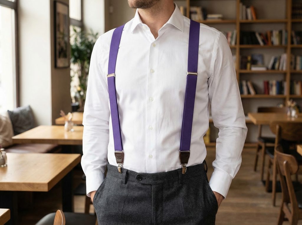 Fialová barva dokáže dodat outfitu osobitý charakter, aniž by působila příliš výrazně. Látkové pánské šle ve fialovém odstínu s tmavě hnědými koženými detaily vytvářejí stylový kontrast, který může elegantně doplnit jak formální oblek, tak i modernější městský outfit.