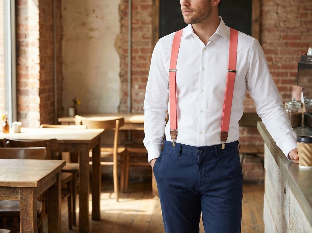 Výrazná barva může být přesně tím detailem, který outfit oživí. Korálové pánské šle s hnědými koženými prvky přinášejí do pánského šatníku svěží tón, který dokáže rozbít klasickou kombinaci košile a kalhot. Teplý odstín korálové barvy vynikne zejména ve spojení s neutrálními barvami a vytváří zajímavý kontrast s hnědou pravou kůží.