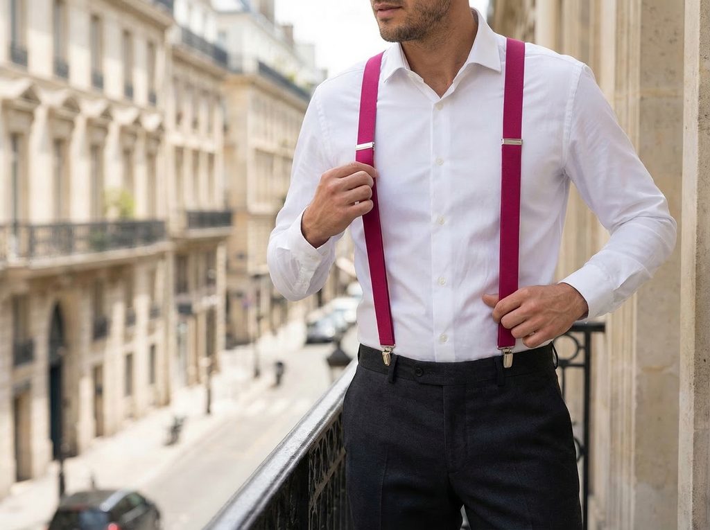 Fuchsiové šle mohou dobře vyniknout například v kombinaci s bílou košilí, tmavým sakem nebo černými kalhotami. Sytý růžovo-fialový odstín dodává outfitu moderní a odvážný barevný akcent.