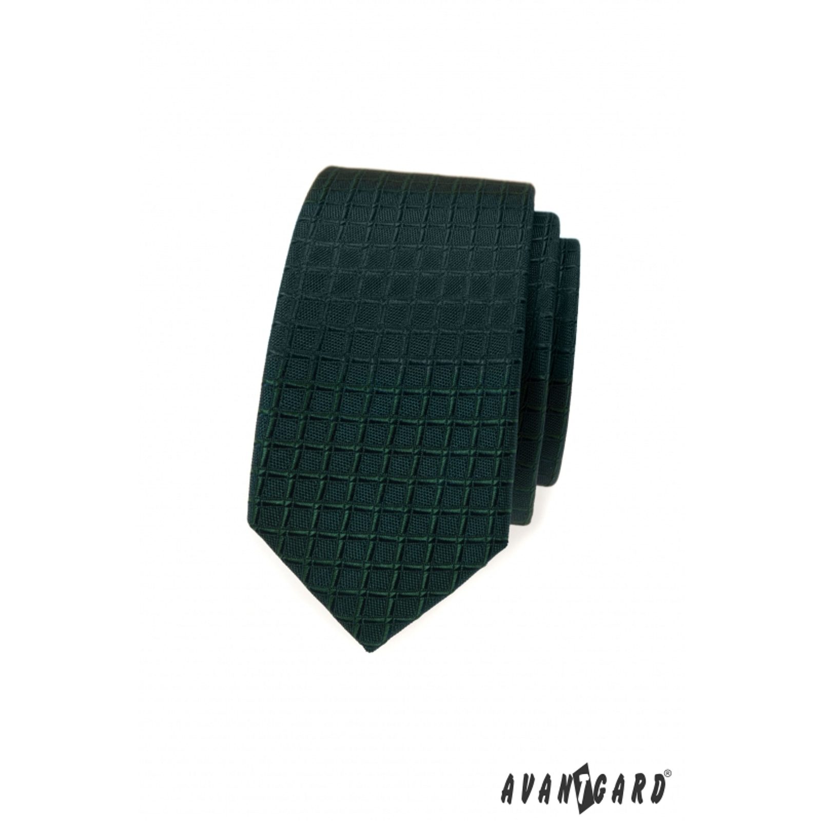 Tmavě zelená slim kravata s mřížkovaným vzorem šířka 5,5 cm je vhodným doplňkem košil proštíhleného střihu SLIM a je tedy určena pro muže štíhlé postavy. Úzké kravaty jsou hitem sezóny a lze je použít do obleku i k džínám.